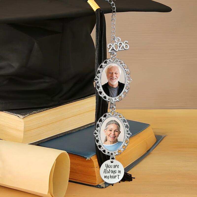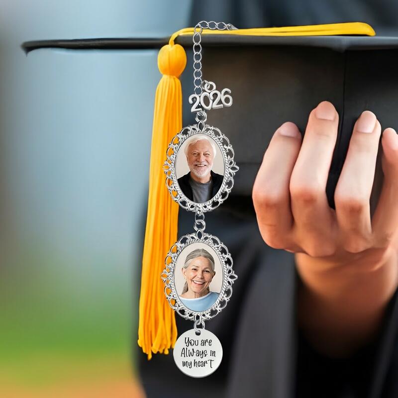 As your child prepares to walk across the stage to receive their diploma, honor this momentous achievement by gifting them this graduation tassel charm. Carefully crafted with attention to detail, this charm pays tribute to a loved one with a custom picture keepsake gift. Add a special touch by personalizing the gift with a photo, name, or a sweet message. A personalized tassel photo charm will be a heartwarming and practical gift for anyone during the upcoming graduation season. Not only is it a graduation cap charm with a picture and a short message, it's also a sweet reminder that your loved one isn't far away, but he or she is always with you in different ways.