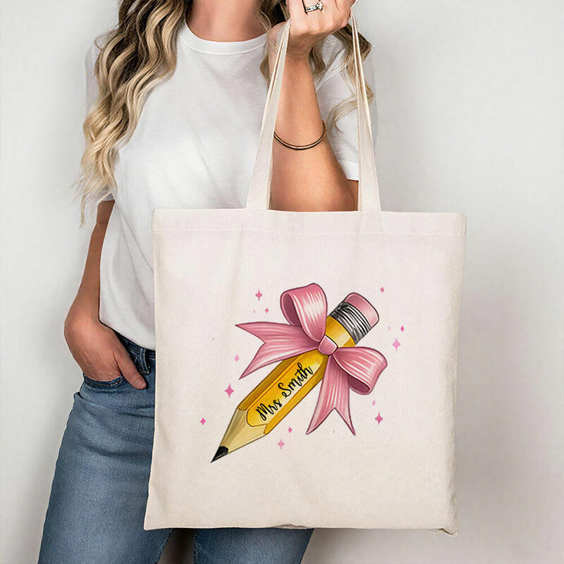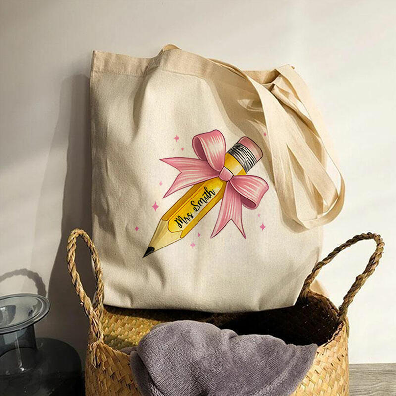 Personalized Canvas Tote with Bow Pencil Foldable Back to School Gift for Teachers