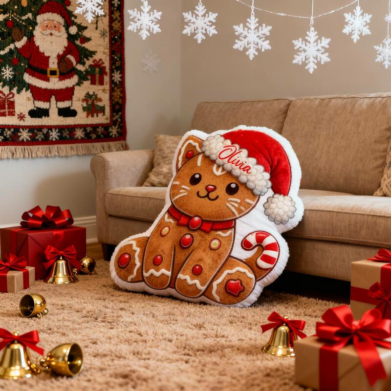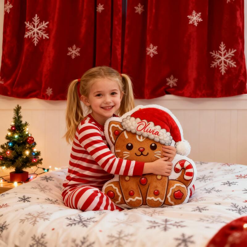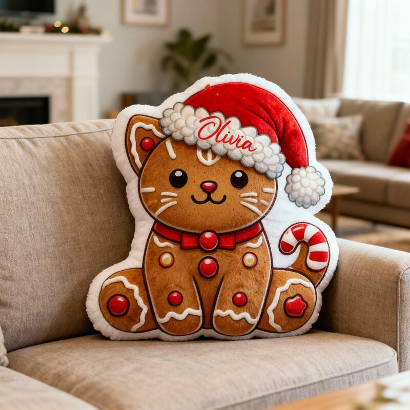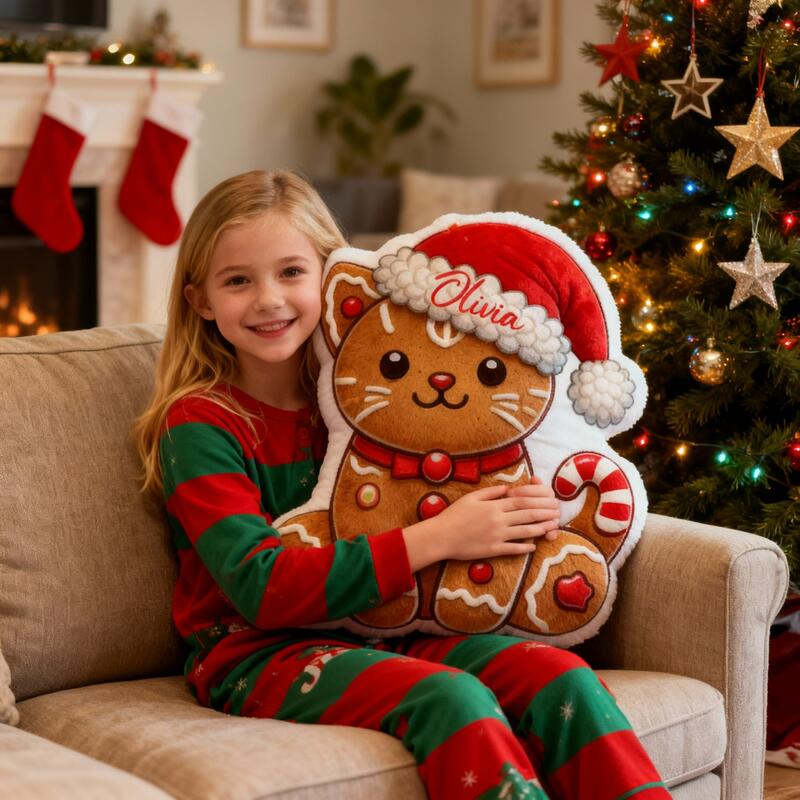 Personalized Christmas Gingerbread Cat Pillow Customizable with Your Name Cute Gift for Girls