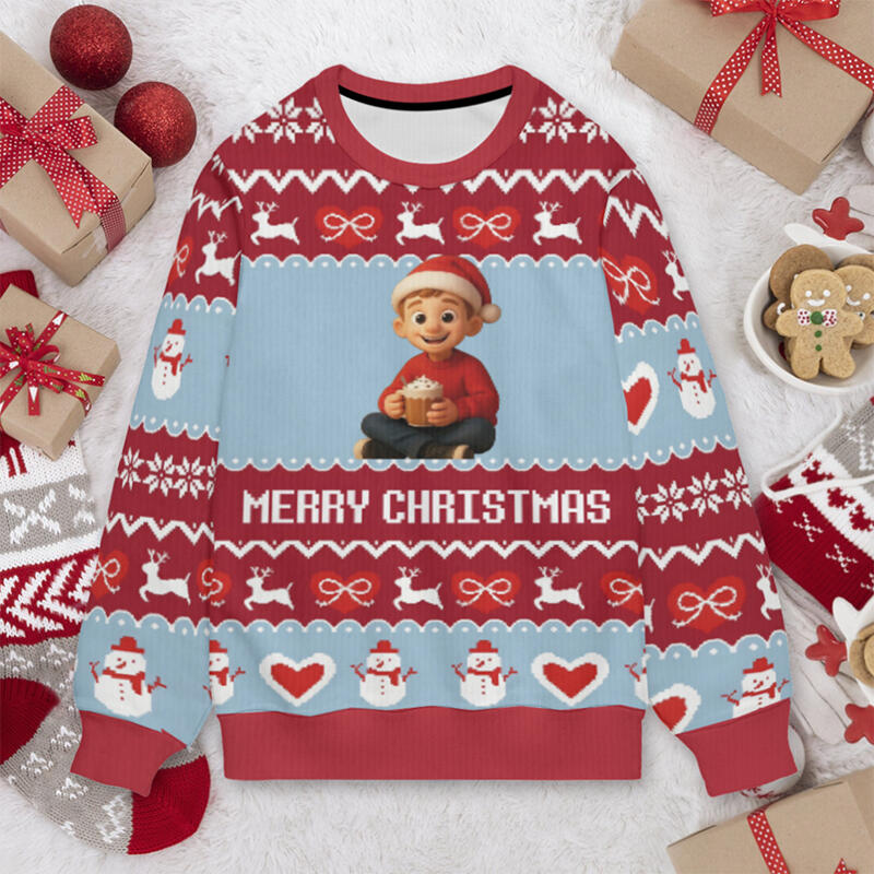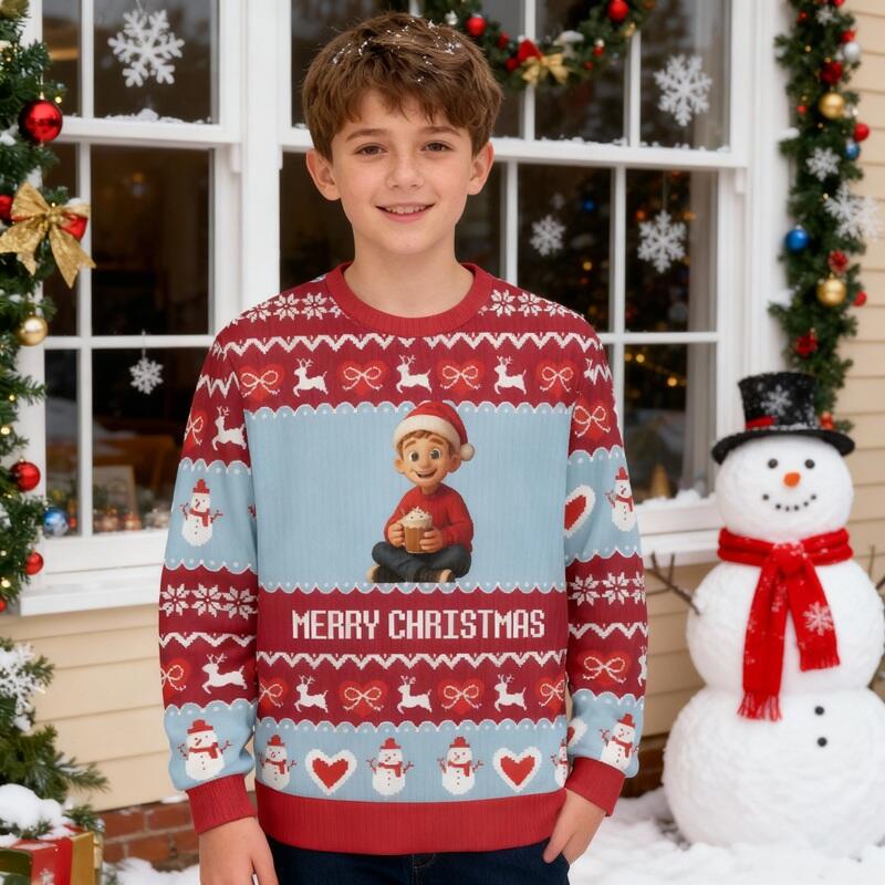 This sweater has a fun custom photo feature that makes it stand out. Pick your child's favorite snapshot (silly family selfies, pup-in-Santa shots, goofy friend photos, or a vivid moment of their own), and we’ll print it in vibrant, long-lasting color right on the sweater. Paired with various Christmas-related patterns, the sweater is filled with a festive vibe. It’s a wearable atmosphere activator, conversation starter and nostalgia trigger for all holiday gatherings.