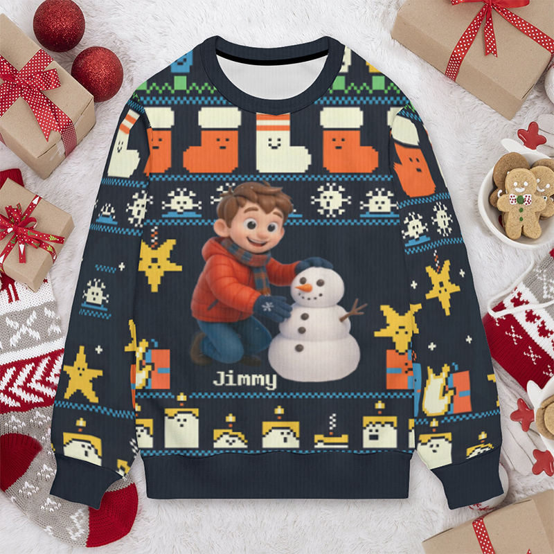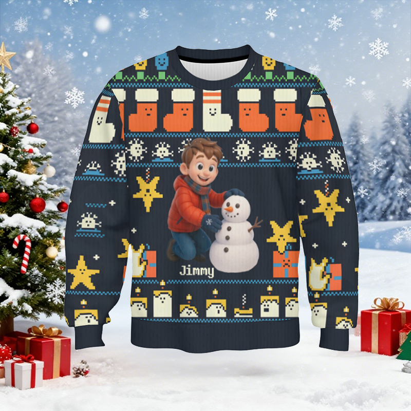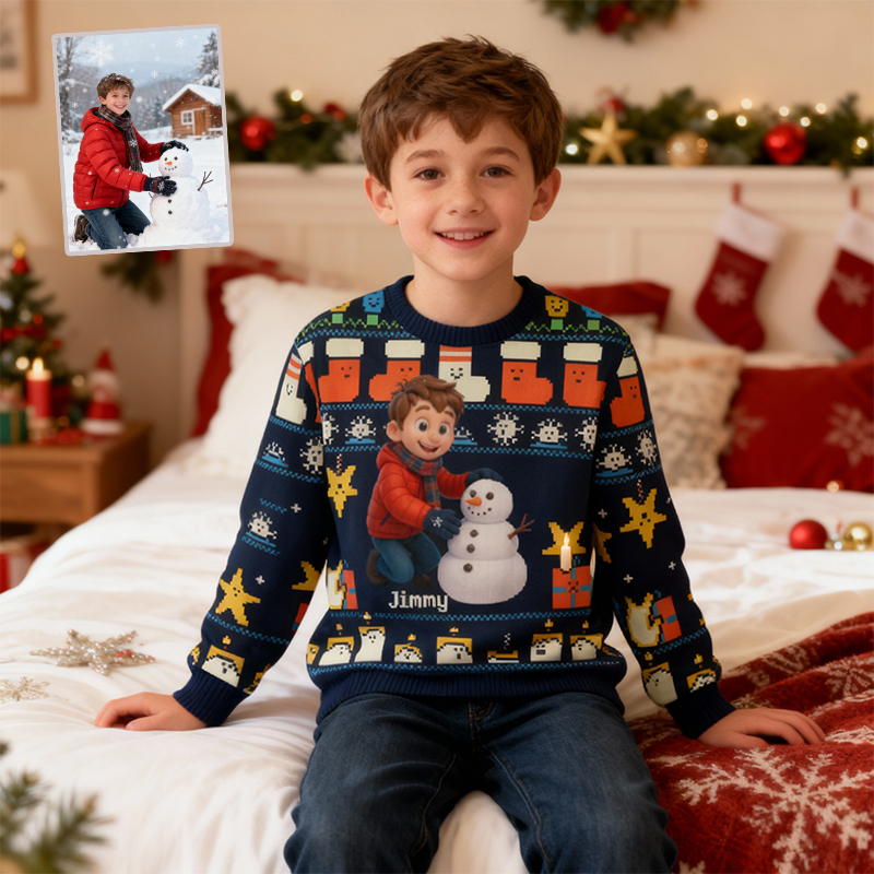 Personalized Kids Ugly Sweater Unisex Custom Photo Cute Cartoon Pattern Design Funny Gift for Christmas
