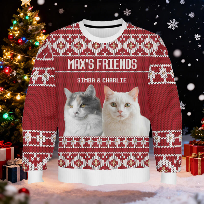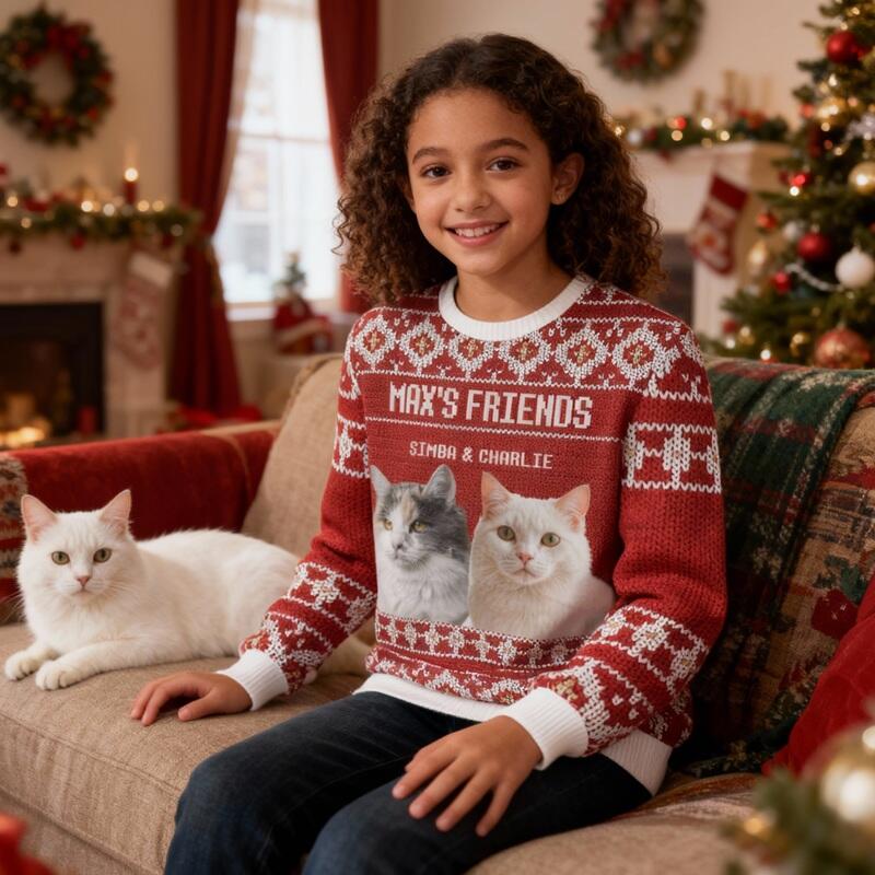 Give gifts this Christmas that are both personal and fun. Imagine the laughter your children will have when they see their pet's expression or a funny family photo. Choose one of our custom ugly Christmas sweaters to create unique, happy, and unforgettable memories, making every wear a special holiday moment!