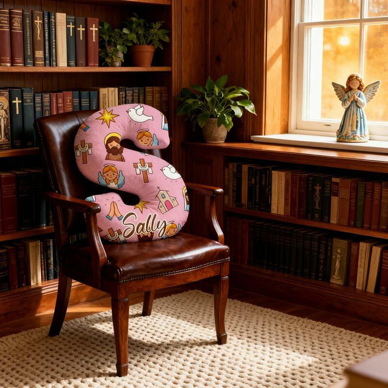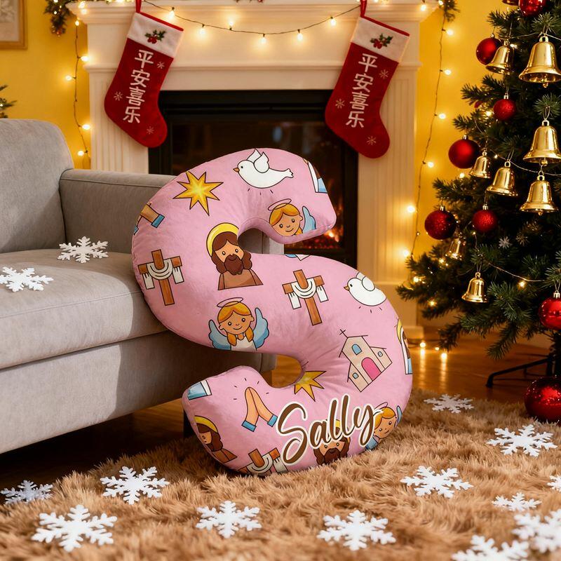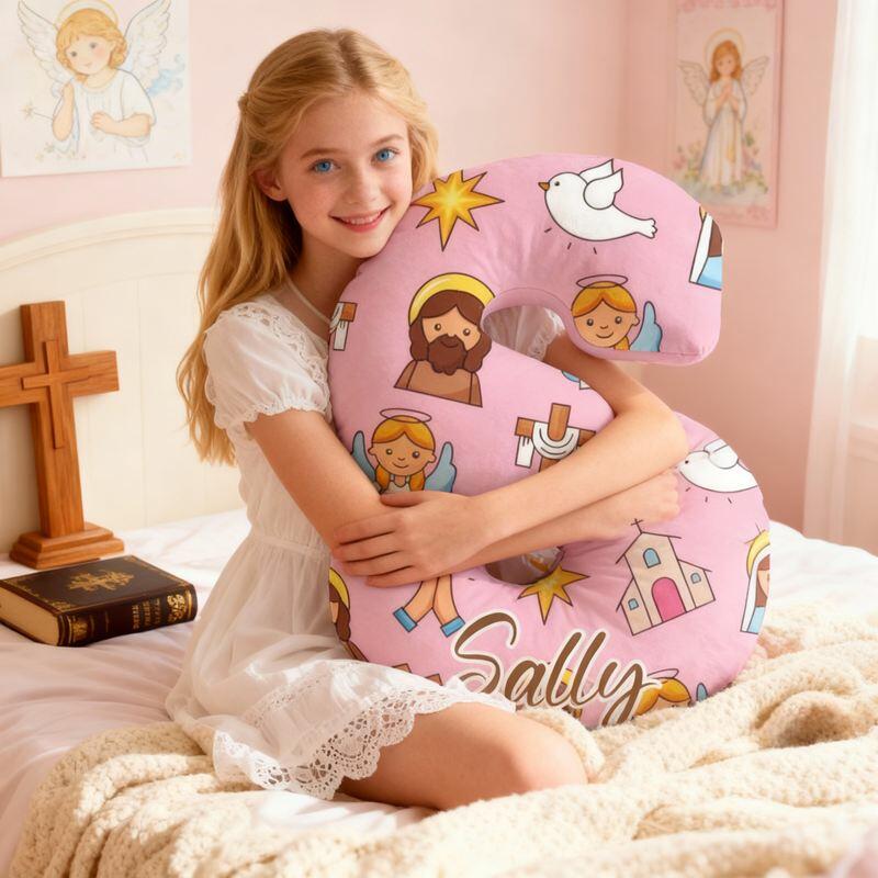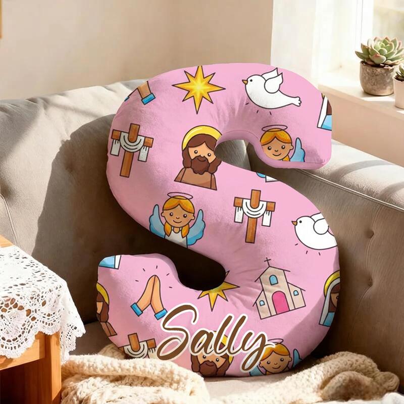 Personalized Letter-Shaped Pillow Jesus Cross Dove Cartoon Design Religious Home Decor