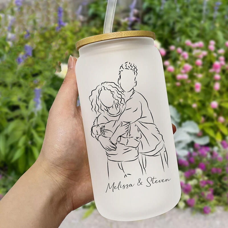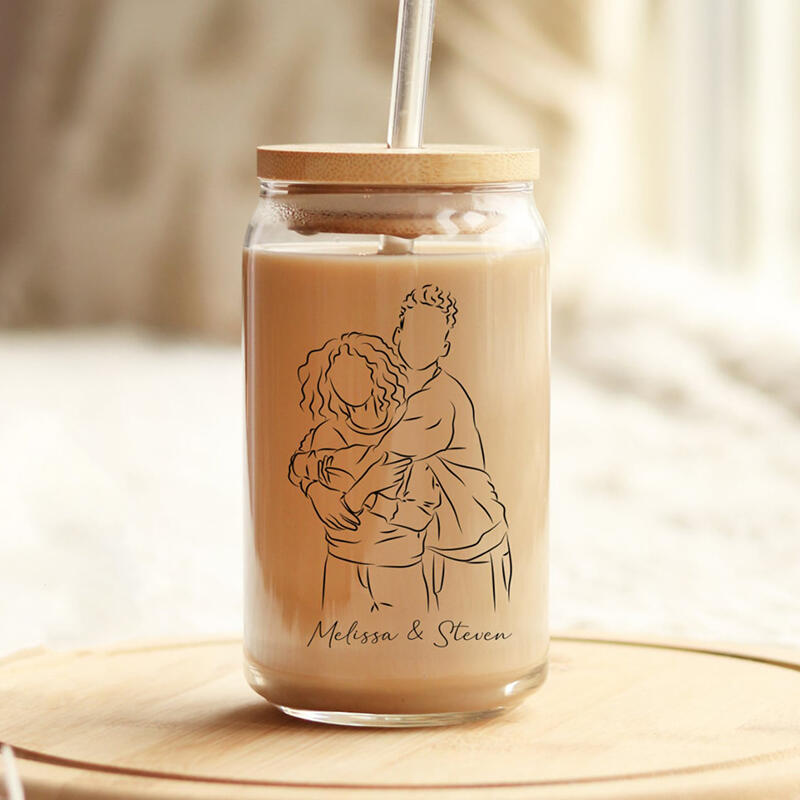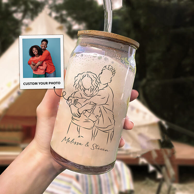 Personalized Picture Glass Cup with Lid And Straw Simple Line Style Best Valentine's Day Gift