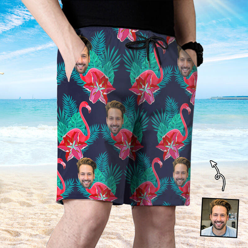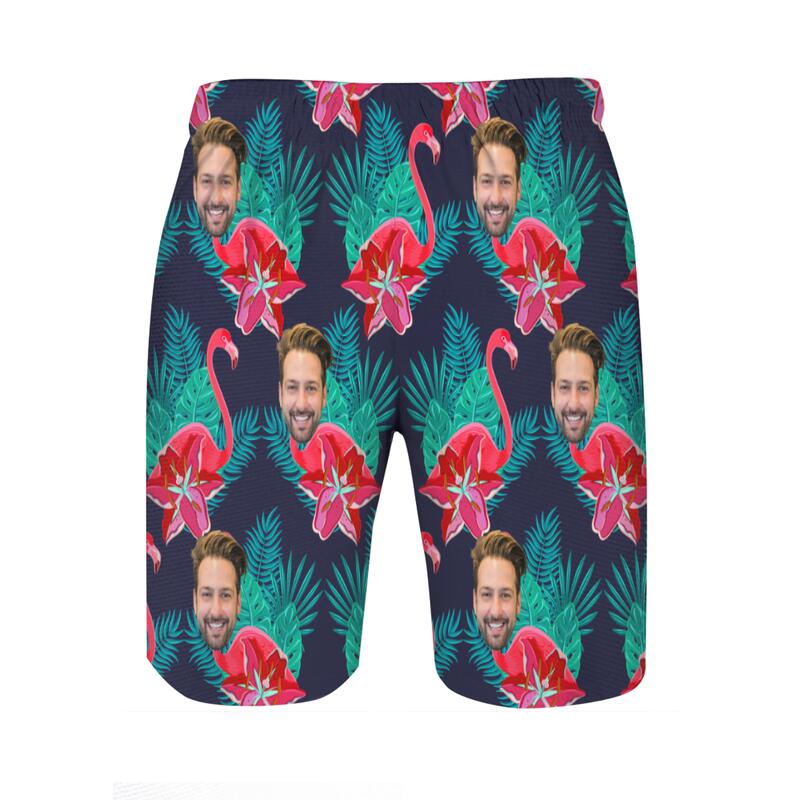 Personalized Picture Men's Beach Shorts with Cute Flamingo Pattern Best Present for Grandpa