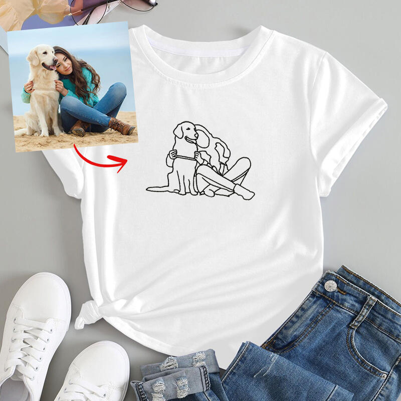 Personalized T-shirt Custom Embroidered Photo Line Drawing of Pet and People Adorable Gift for Pet Lover